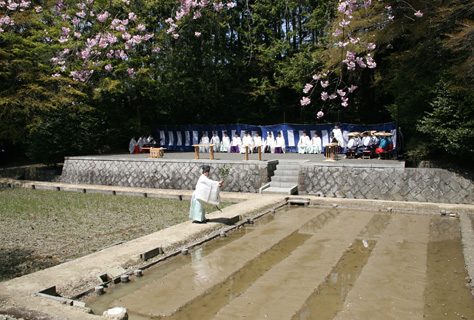 4月12日の水口播種祭にて籾種が撒かれ、成長した稲苗を神田に植えるお祭りです。本殿祭の後神田にて、王朝をしのばせる典雅な「御田舞」が奏される中を“早乙女”らによって田植がすすめられます。