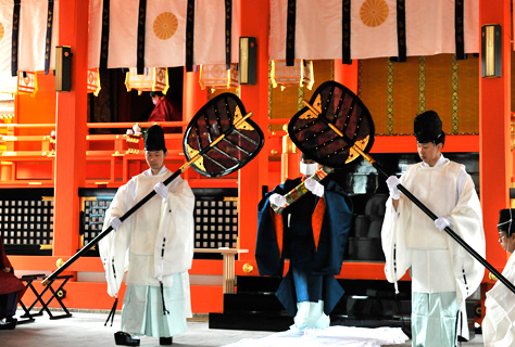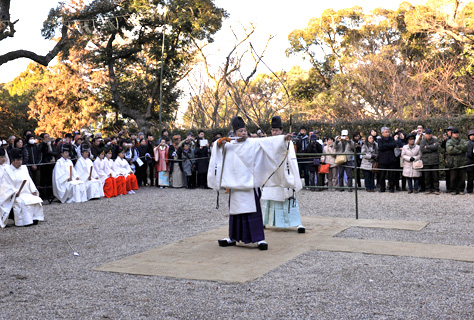 いわゆる御弓始神事で、年頭にあたって邪気や陰気を祓い陽気を迎える神事です。本殿祭の後、神苑祭場で副斎主が神矢をもって天地四方を射、つづいて神職二名が真矢で大的を射ます。