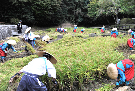 4月の水口播種祭、6月の田植祭と大神のみたまの働きによって成長し稔った稲を刈り取るお祭りです。刈り取られたあと新殻は、11月23日の新嘗祭に稲荷大神にお供えされ稲藁は火焚祭において焚き上げられます。