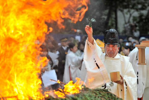 本殿の祭典にひきつづき、神苑祭場において、全国崇敬者から奉納された十数万本の火焚串を焚きあげ、宮司以下神職をはじめ参列者一同、大祓詞を奉唱して、罪障消滅、万福招来を祈ります。