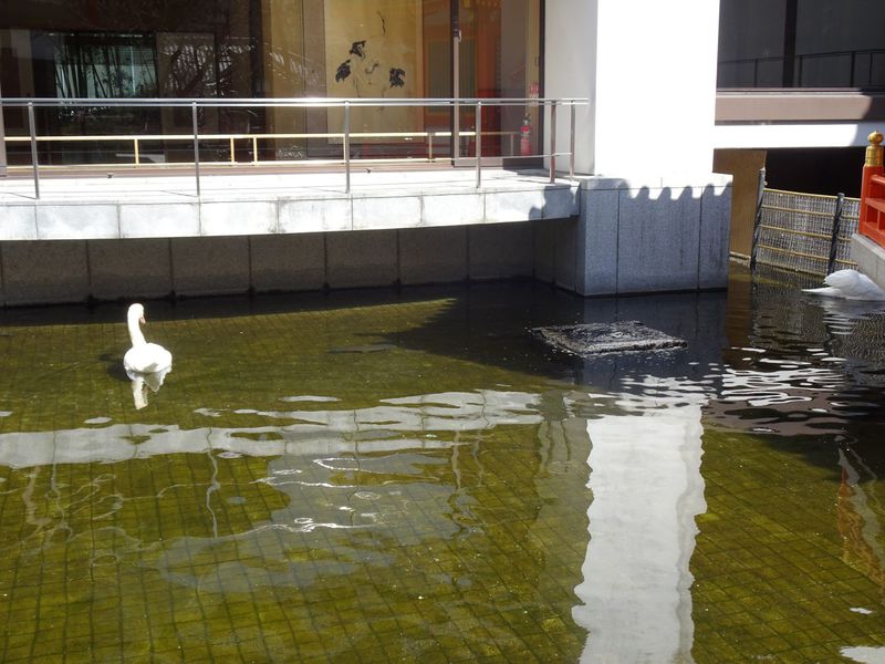 現代の境内整備事業で池がよみがえり、白鳥や鯉が泳いでいます。