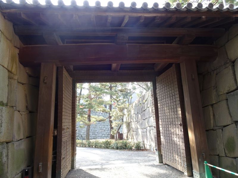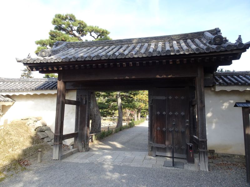 1626年(寛永3年)頃に建設され、江戸時代には二条城の通用門として使われていました。1788年(天明8年)の大火で周辺の櫓門等が焼失し、明治以降には外堀にかかる木橋も失われ、今ではこの西門だけが残っています。門の上に立つ土塀と石垣に囲まれることから「埋門(うずみもん)」と呼ばれますが、屋根だけを見れば「高麗門(こうらいもん)」です。高麗門とは、死角をなくすために屋根をできるだけ小さくした門で、柱の上にしか屋根はありません。この門を突破されても、正面に櫓門が待ち受け、敵をその2階や石垣の上から攻撃することになりますが、その際、屋根が邪魔にならないように考えられた造りとなっています。