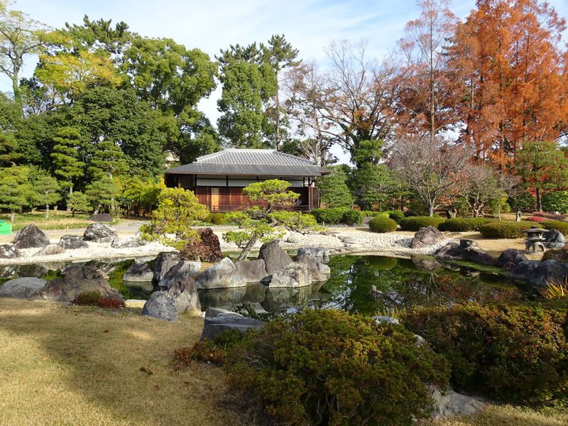 1603年(慶長8年)の築城時に作られ、1626年(寛永3年)に作事奉公・小堀遠州のもとで改修された庭園です。