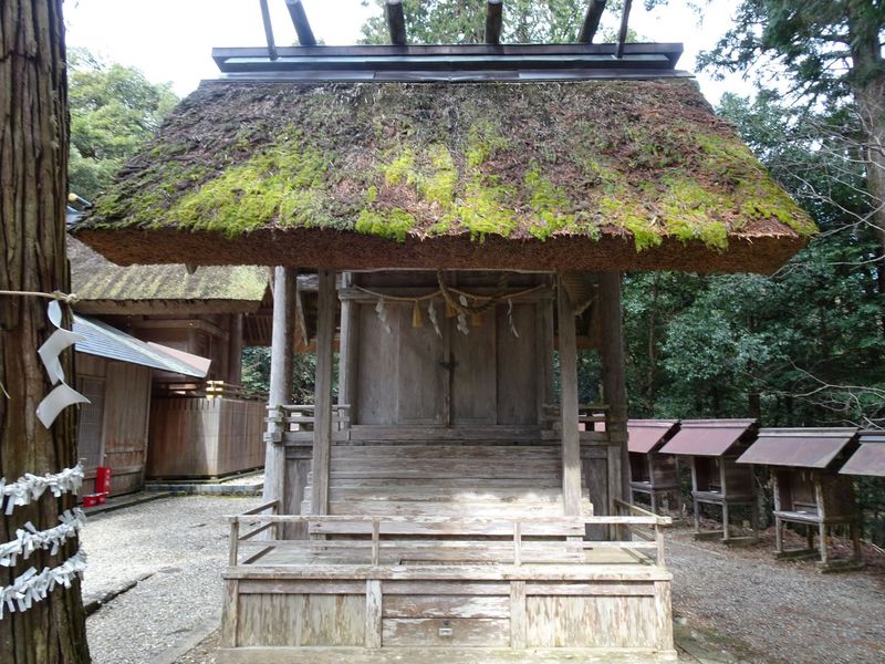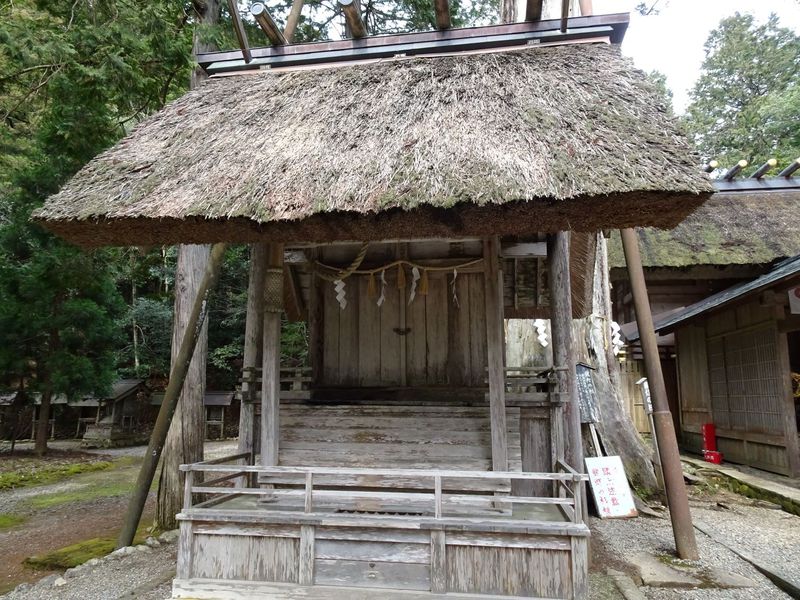 全国的にも少ない茅葺の神明造り。左右に棟持柱があります。基礎に台石を用いる他は、伊勢神宮の古制と同じです。