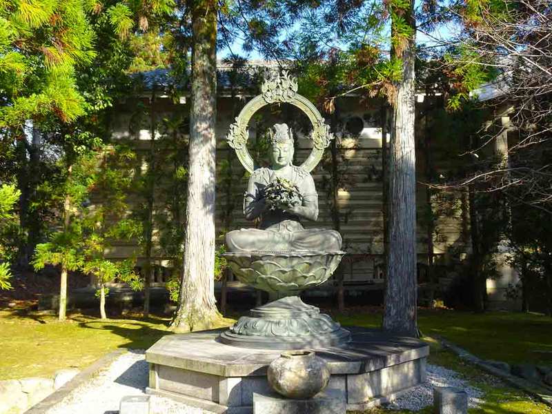 済信塚と霊宝館の間にある金剛界曼荼羅の金剛華菩薩の像で、左手には宝相華を盛った器を持ち、右手で器をはさむような姿をしています。
