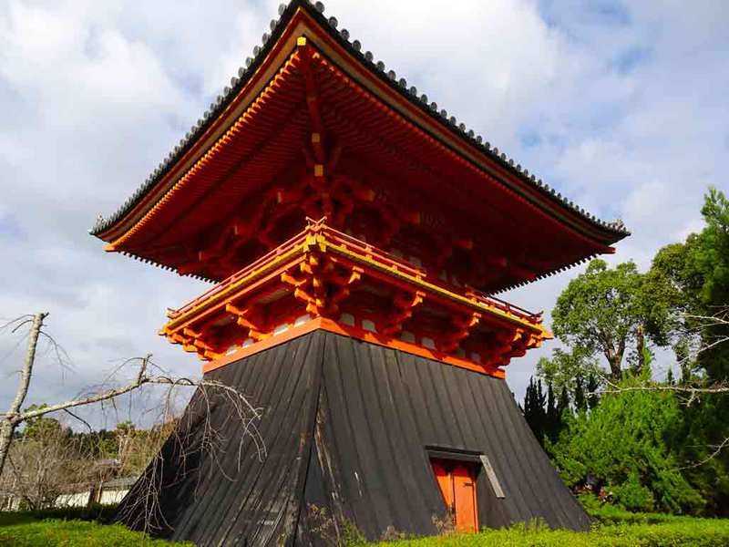 江戸時代初期に建立され、階上は朱塗で高欄が周囲を廻り、下部は袴腰式と呼ばれる袴のように裾が広がる形状の板張りの覆いが特徴的です。