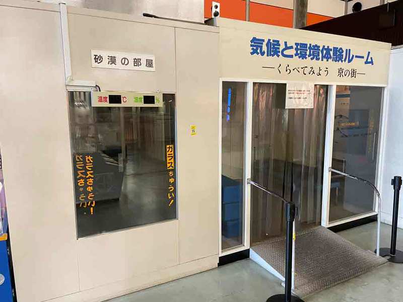 乾燥した砂漠の部屋と多湿の京都の夏の部屋があり、同じ気温でも湿度の違いで暑さの感じ方が異なることを体験できます。