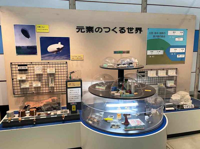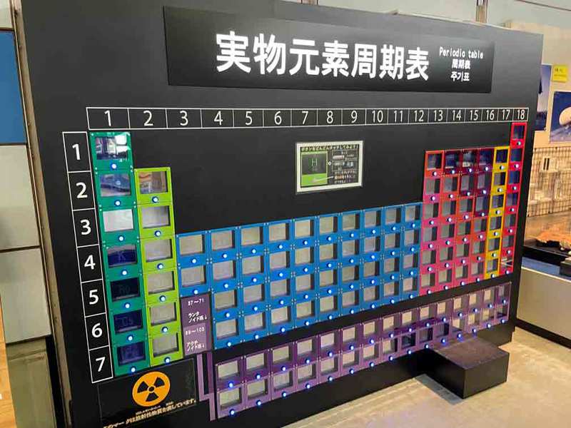 大きな実物元素周期表にはこの118種類の元素が書かれていて、元素のスイッチを押すと箱の中にある元素の実物とそれが利用されている物が見られる仕組みになっています。