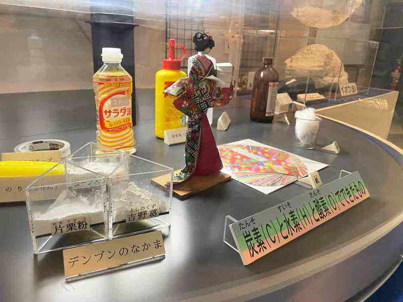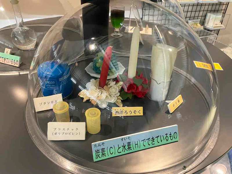 また、手前にあるエレメント・サーチボックスでは元素の紹介や実験の様子を映像で見ることができ、横の展示コーナーでは炭素(C)と水素(H)と酸素(O)の3種類の元素の化合によって出来る様々な物質が展示されています。
