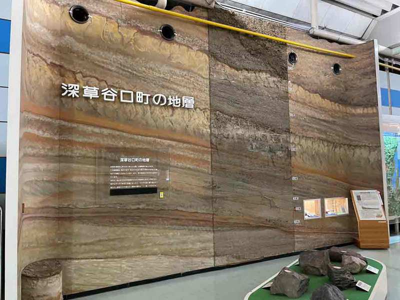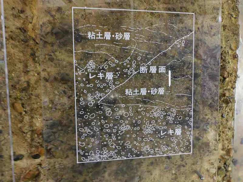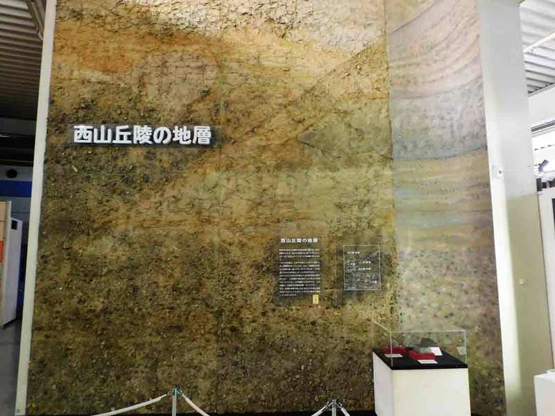 京都市南西にある西山丘陵と、京都市伏見区深草谷口町の本物の地層を剥がし取ったものが展示されています。