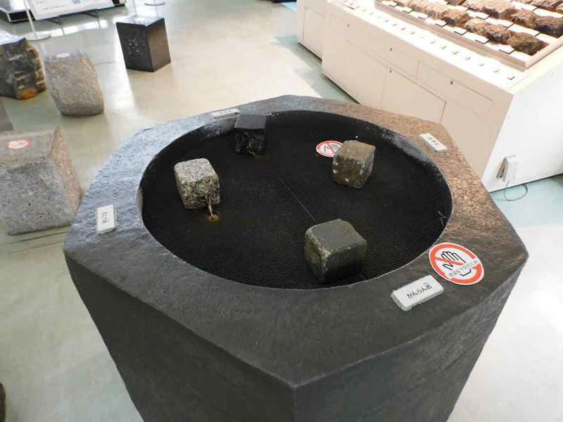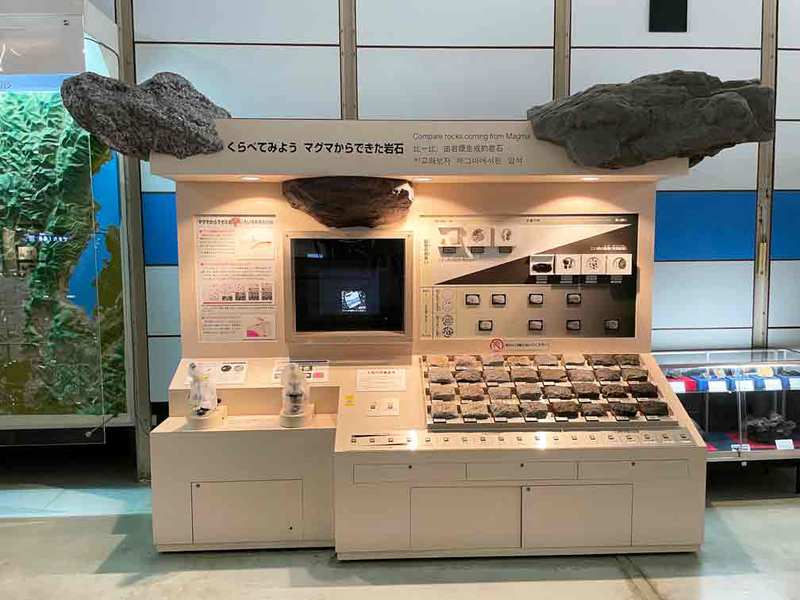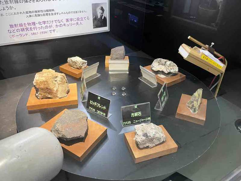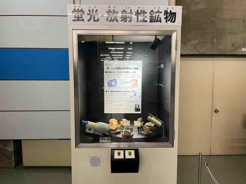 蛍光を出す鉱物と放射線を放つ鉱物、マグマからできた岩石が展示されています。