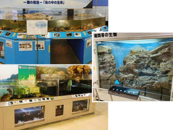 鴨川の水槽では上流(雲ヶ畑付近)と中流(出町付近)を、海の磯の水槽は三重県志摩市にある京都市野外教育センター奥志摩みさきの家付近の磯をモデルとして作られています。
