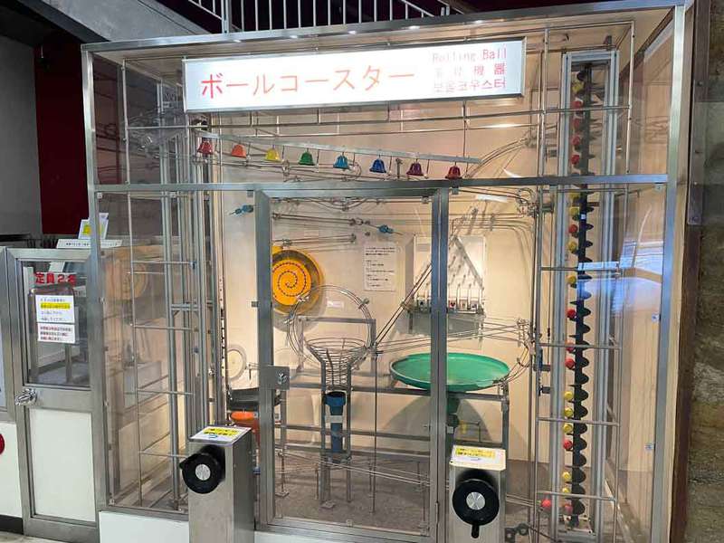 ハンドルを回してレールの上まで運ばれたボールが、落下するときのスピードの変化や、クッション作用、衝突などの現象による変化が観察できるコーナーです。