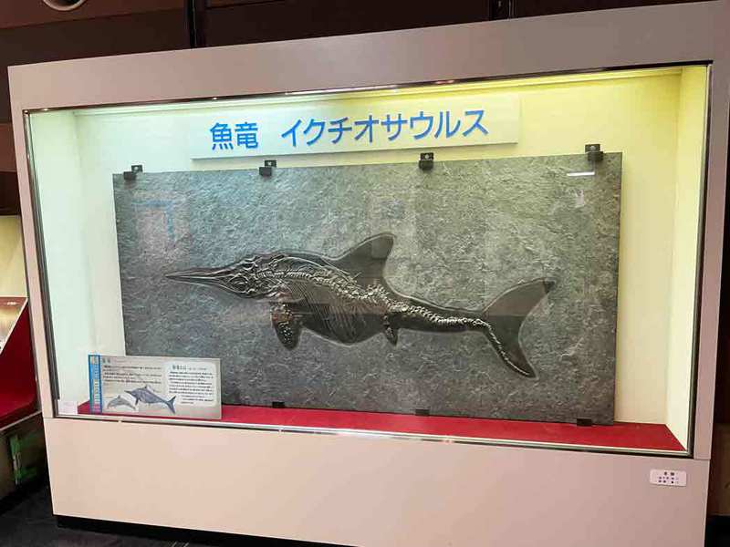魚竜と呼ばれる海生爬虫類の1種で、約2億5000万年前に現れて恐竜の絶滅よりも早い9000万年前に絶滅してしまったイクチオサウルスの実物化石です。
