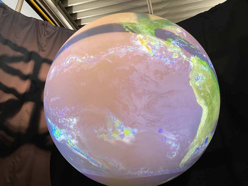 第2展示場にあるみらい地球儀は、直径1.7mもある球体に2台のプロジェクターを使って地球科学のデータなどが投映される日本初のシステムです。