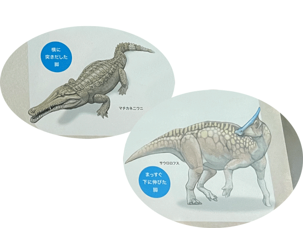 たとえばワニの脚は、胴体から横に突き出しているのに対して、恐竜の脚は胴体からまっすぐ下にのびています。
