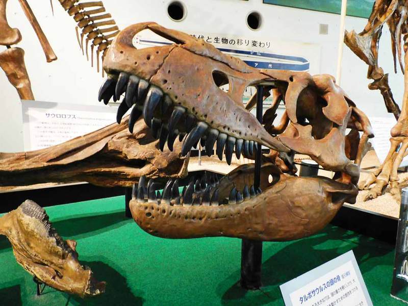 タルボサウルスには永久歯というものがなくて、ダメになった歯は抜けて新しい歯がどんどん生えてくるので、模型のように長い歯や短い歯があってでこぼこしています。