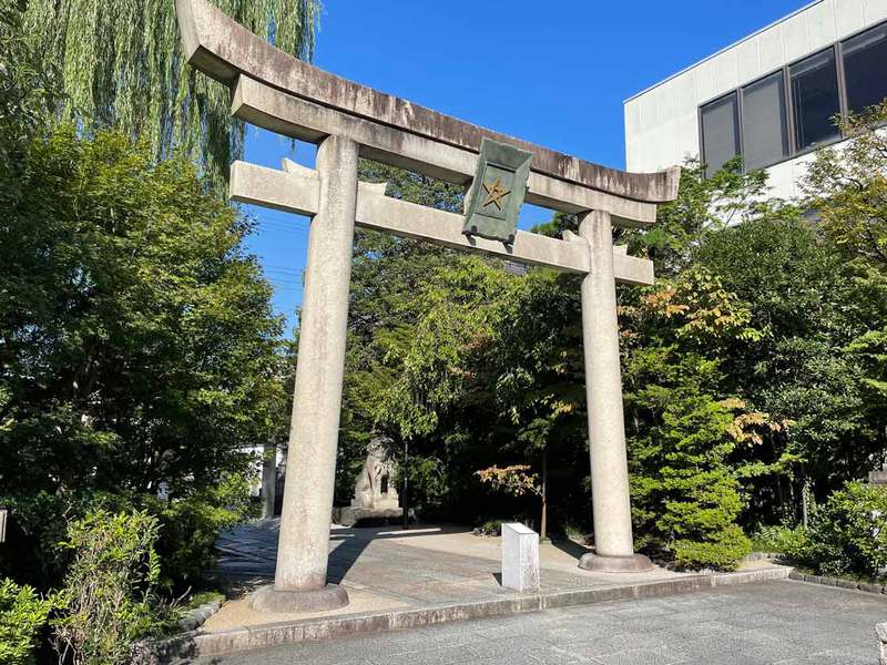 通常鳥居の額には、神社名やお祀りしている神様の名前が掲げられていることが多いですが、この鳥居には社紋の「晴明桔梗」が掲げられており、全国的にも珍しいものといわれています。