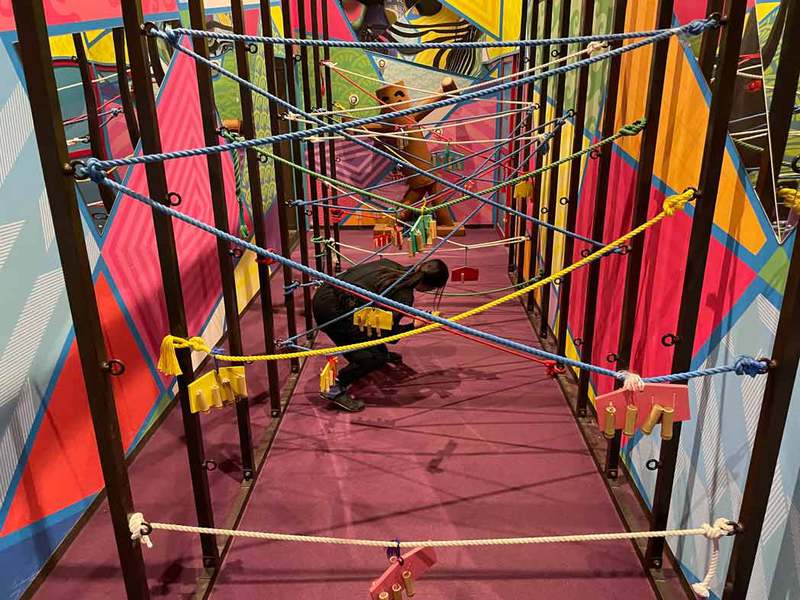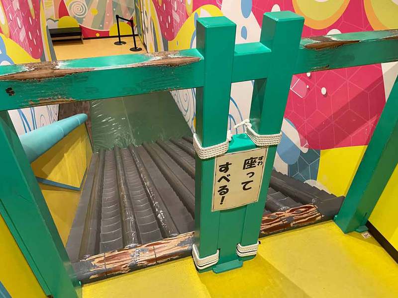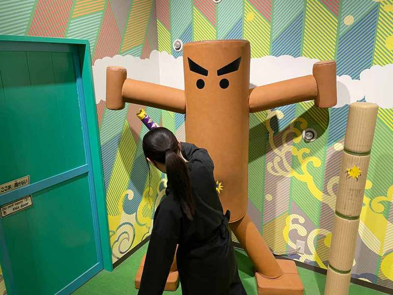 待ち受ける「丸太橋わたり」「鳴子くぐり」「床下ひそみ」「大屋根くだり」などを搔い潜り、ビニール製の刀で随所に現れる木の人形をなぎ倒していく忍者修行のアスレチックです。